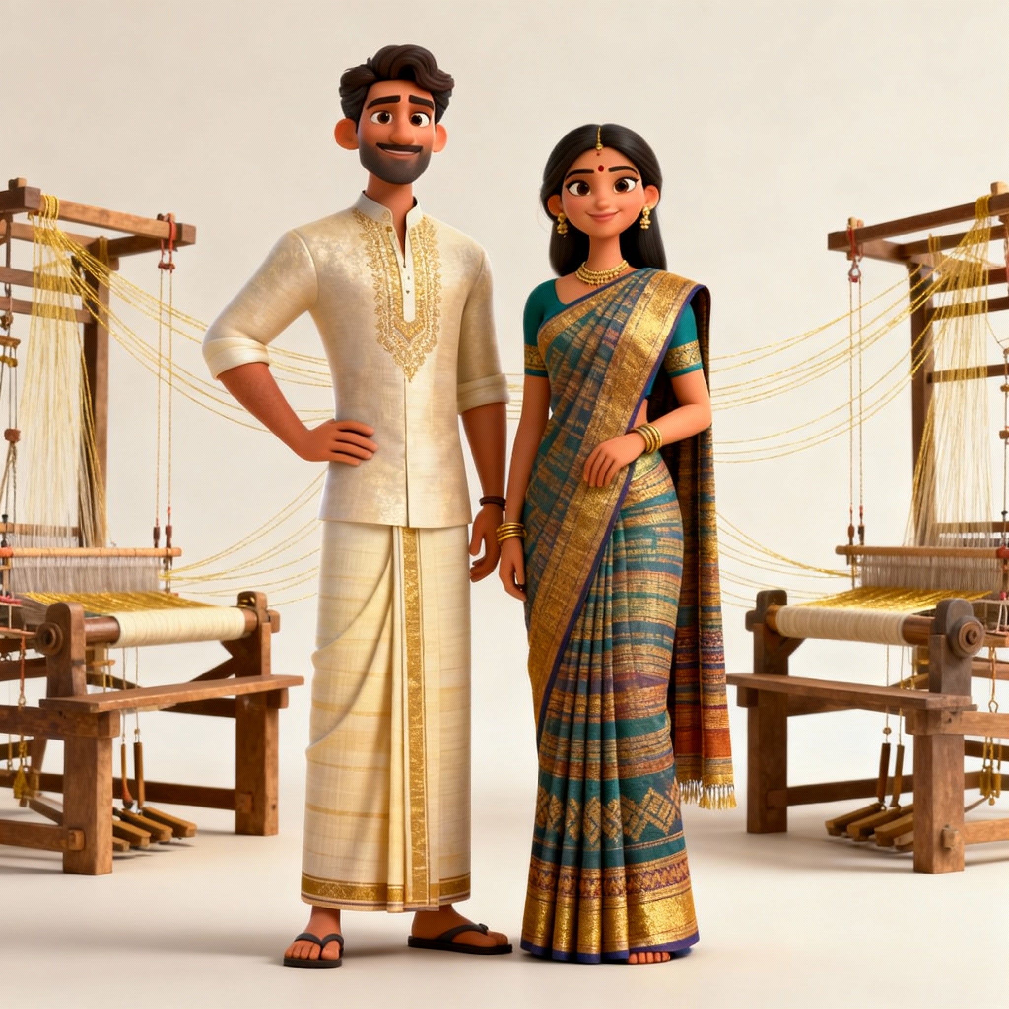 These artisans brought with them unmatched skill in fine cotton and zari weaving. Each piece they created — from royal attire to temple offerings — embodied devotion, precision, and purity. Over generations, their craft became the heartbeat of Balaramapuram, defining Kerala’s most treasured handloom heritage.